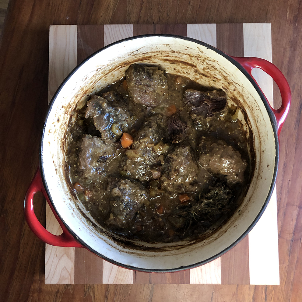 - Mettre le couvercle sur la cocotte et amener à ébullition sur le feu. Enfourner pendant 2 heures ou jusqu’à ce que les joues soient très tendres.