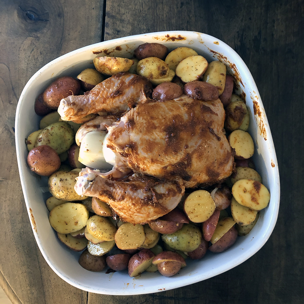 - 1kg de patates coupées en quartier et assaisonnées d’huile, sel et poivre, préparation du poulet (si il en reste), et des herbes (Provence, thym…)